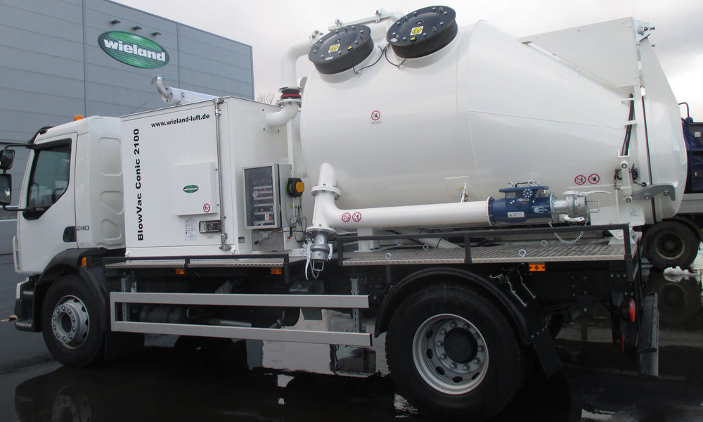 Таким образом, компания Wieland сделала доступными вакуумные агрегаты BlowVac Conic с максимальным расходом воздуха 3700 м3/ч. В основном эти сборные контейнеры устанавливаются на двухосные грузовики, с допустимой общей массой 18 т. или альтернативно на двухосный прицеп, или опорную раму, которую можно перемещать с помощью подъемного механизма.